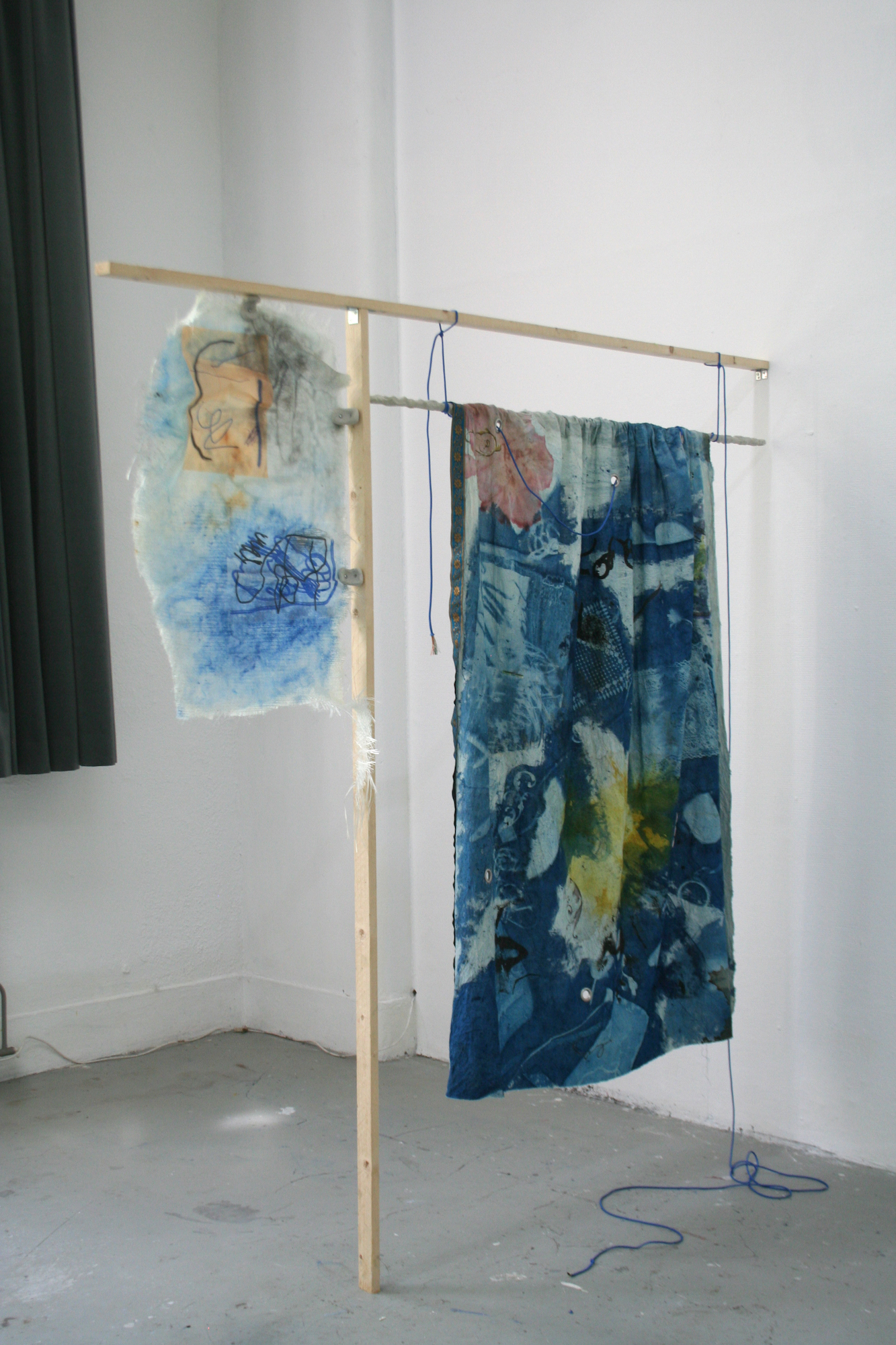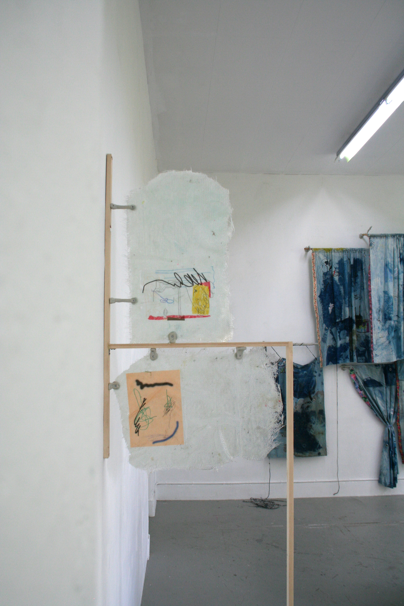 When I caught up with Arash again, in late May, the work was well underway. A series of replica windows were under construction alongside the ongoing practice of epoxy composite drawings in compressed plastic shards, and with two newer elements of cyanotype textile prints and comical astro-turf hedge- units, autonomously assembled on wheels. We looked at the visual diaries that informed the work, and talked about the long-term artistic questions that drive the work. How to trace images through material and virtual worlds? How to stage sculptural frontality as an image itself? How to artistically cognize the truths of acculturation, and political climates, without becoming their servant?