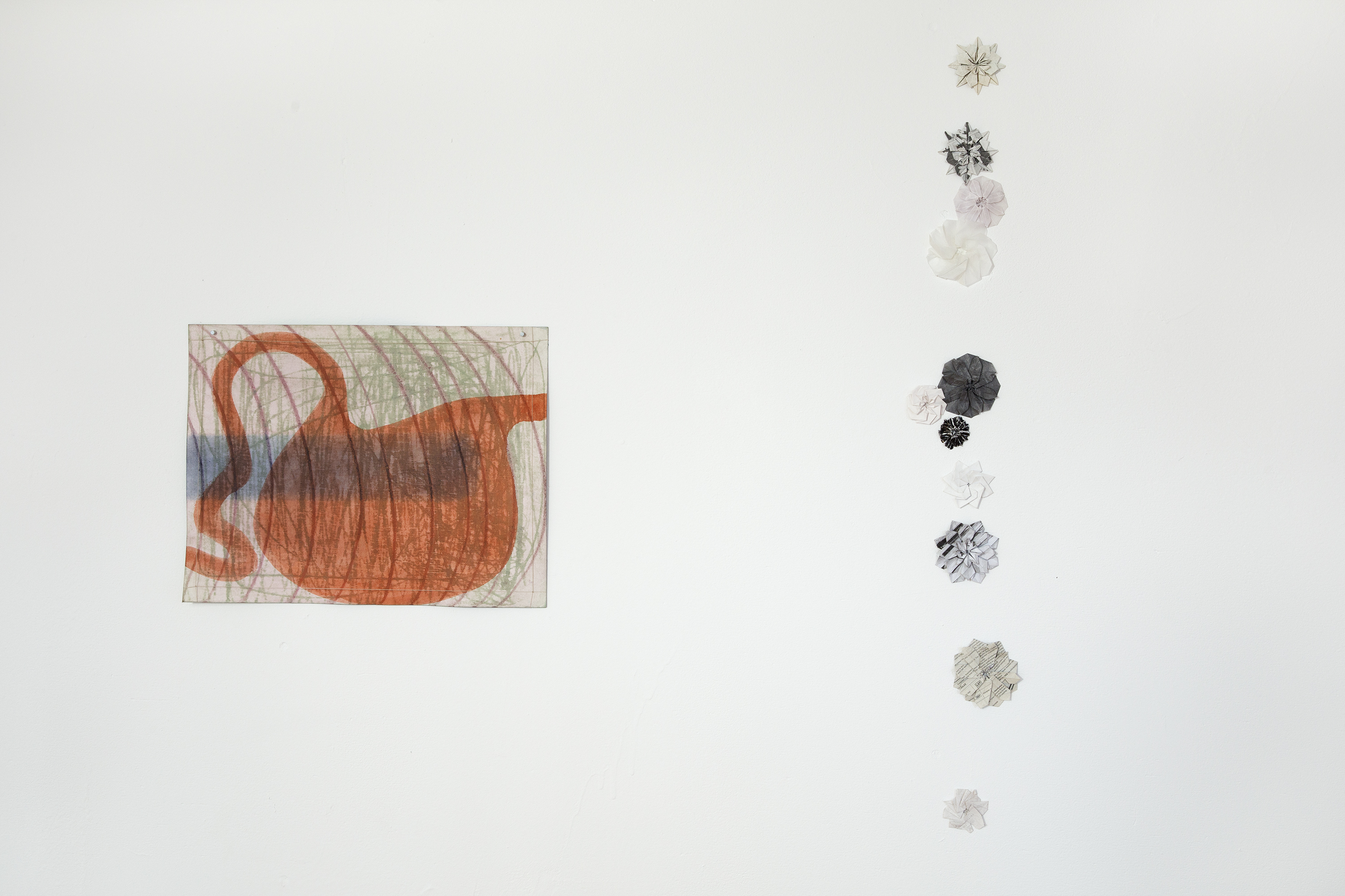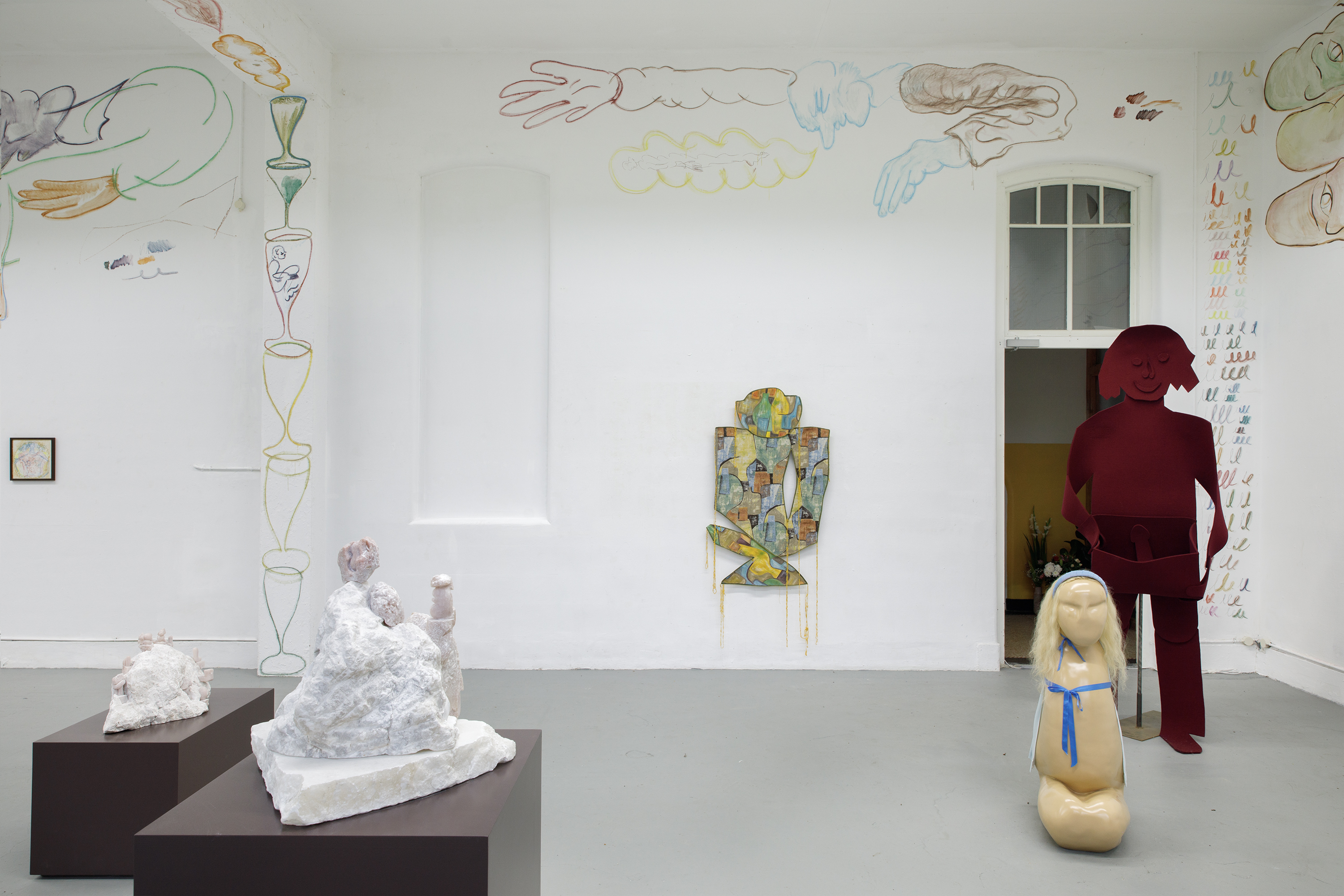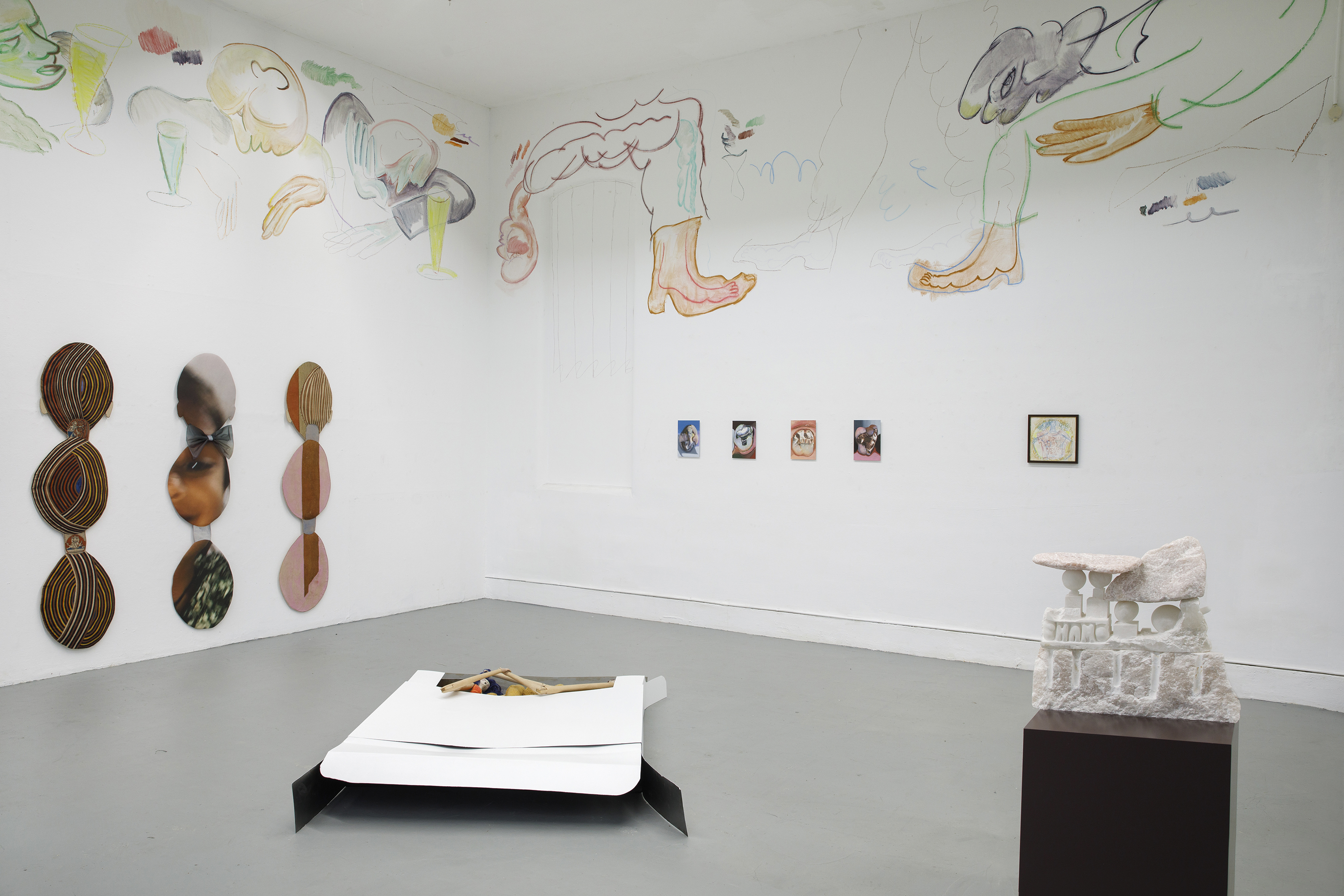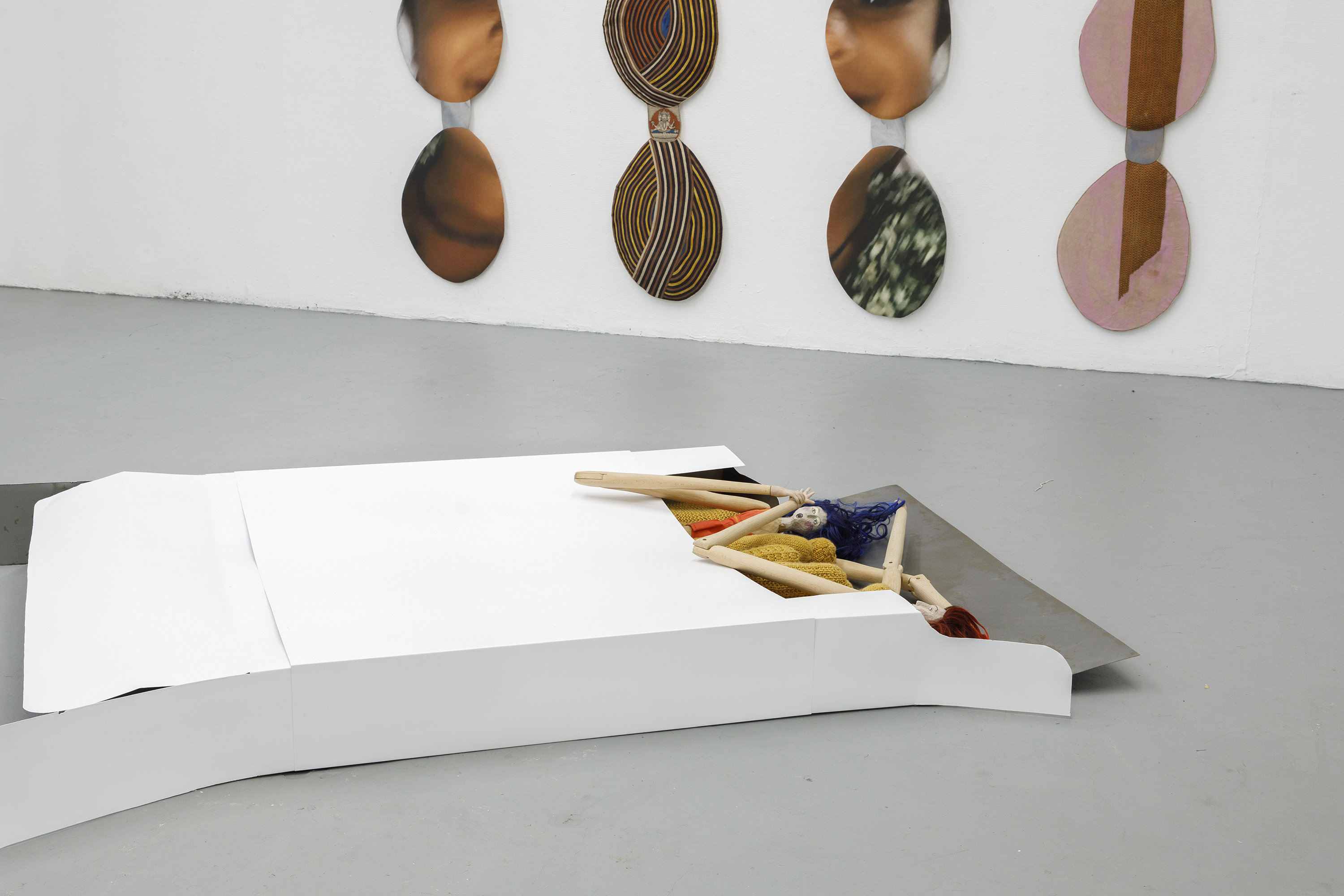 This exhibition started with a welcome invitation to a group of artists we feel close to and whose work we feel a great affinity with. We received costumes for absent sculptures, voluptuous stone carvings, a well meaning felted flasher, the story of an unseen character in a New Orleans swamp, the history of a nun with a self healing jaw. Traces, imprints and impressions started to draw the outlines of bodies and characters.
