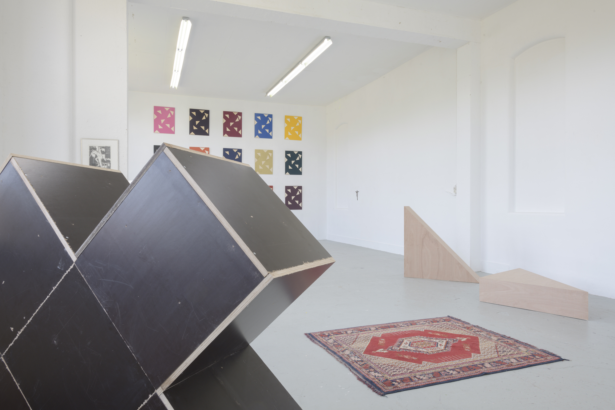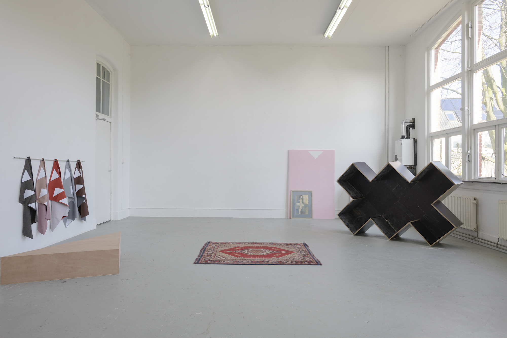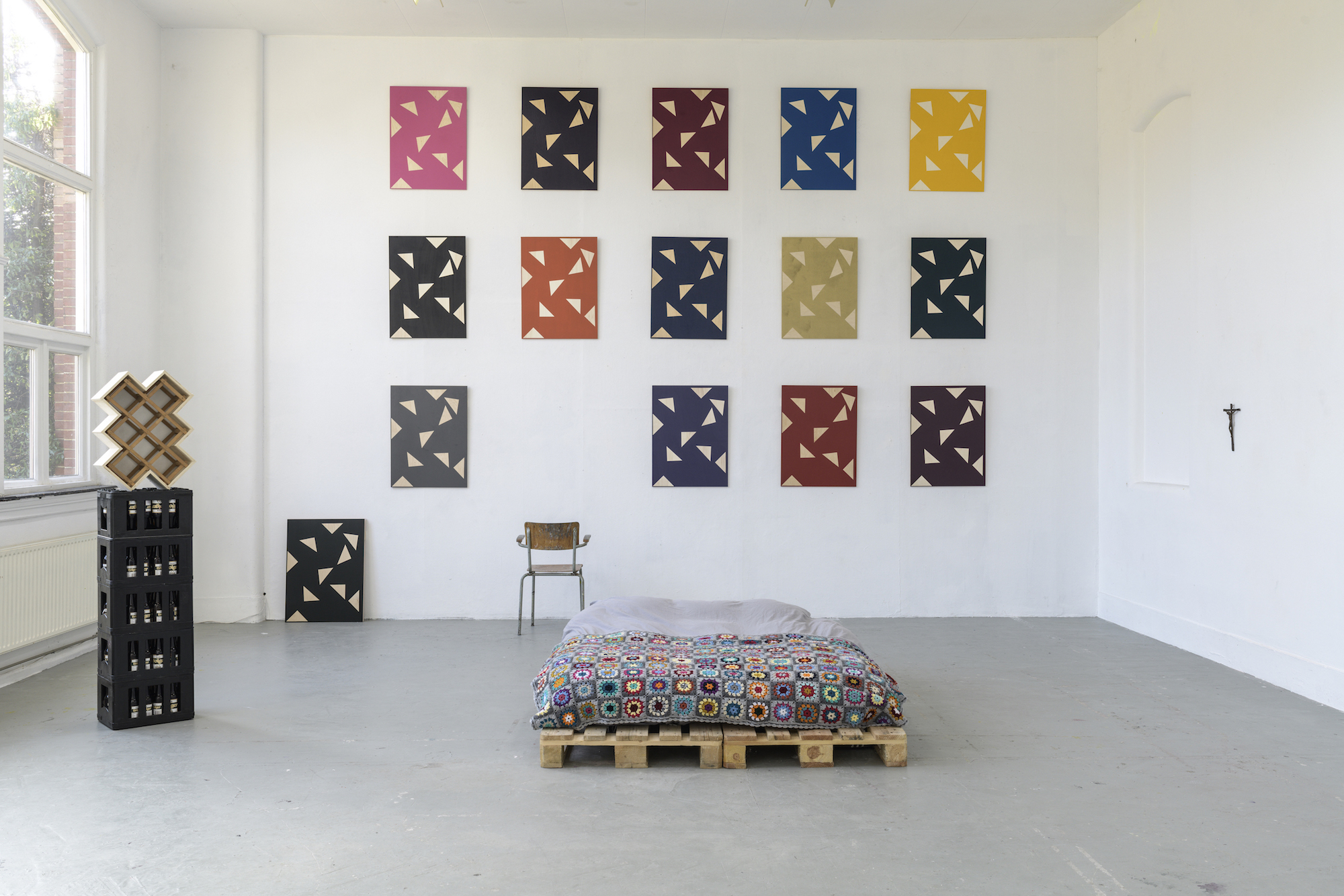 The casual remark by Kuipers about her having friends ‘outside the arts’, suddenly becomes meaningful. During my previous visit to the studio, there was a stack of beer crates with a painted wooden panel on it, tied together with a strap. The construction was build when Kuipers invited her friends over and thought she needed a table. For the occasion one of the painted panels hanging monumentally on the wall, was lifted from its pedestal for some airier entertainment. Such an intervention made me think of there being two types of artists: those with a social life and those that are married to their work. Through the light-footedness by which she fills the art space, without ever forgetting the viewer, I see Kuipers being one of the first category.The remark is hardly a statement for the half-abstract, half commonplace work she makes and yet it provides insight as to which decisions Kuipers makes in her work. While she’s making changes, she always takes the viewer into account, hoping they can still follow her reflections. I therefore suspect that her grandfather’s paintings, the chair, the bed, the carpet and the religious imagery are intended as support. They are residues of life and help the viewer to understand that Kuipers view on the matter isn’t always through the language of art.