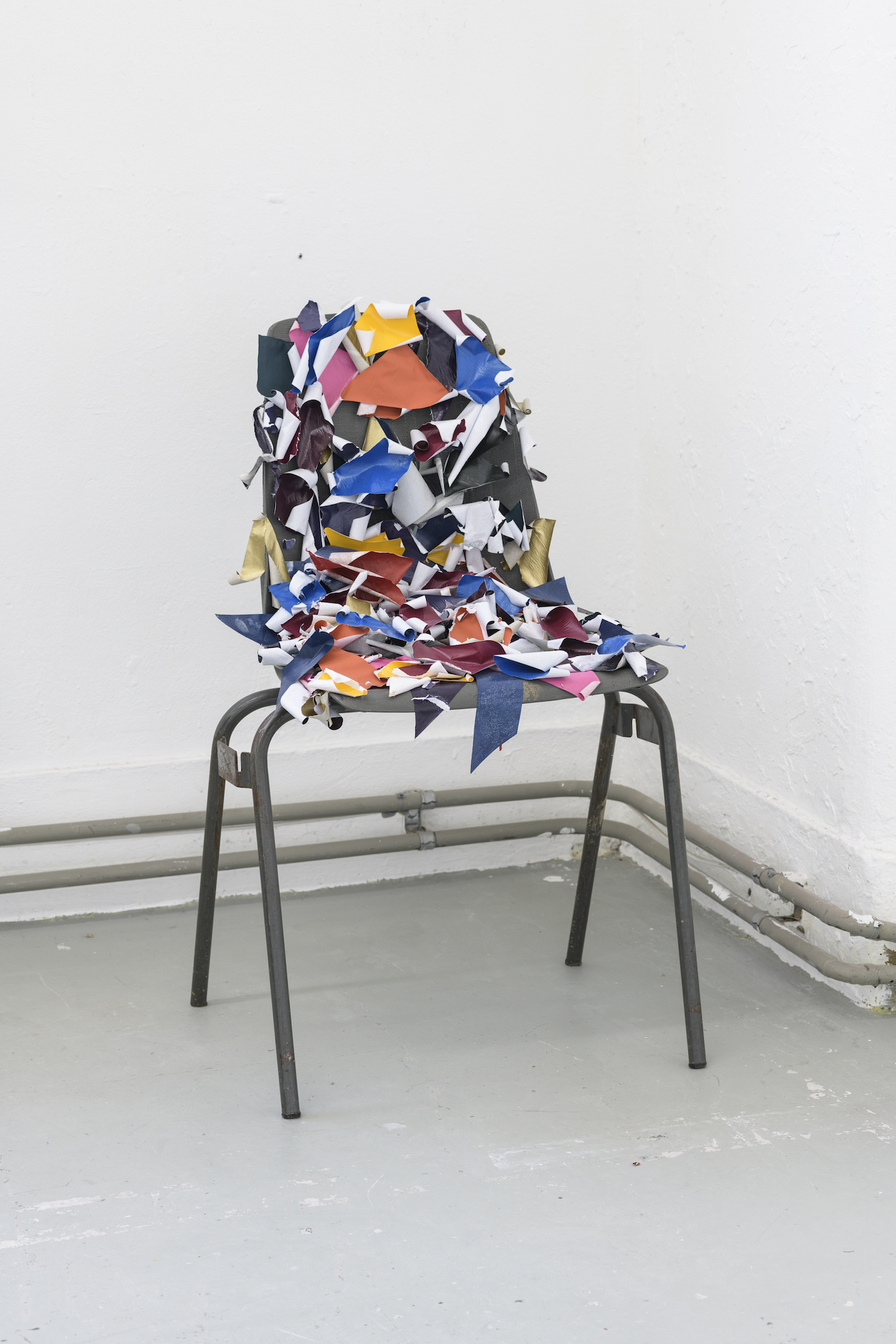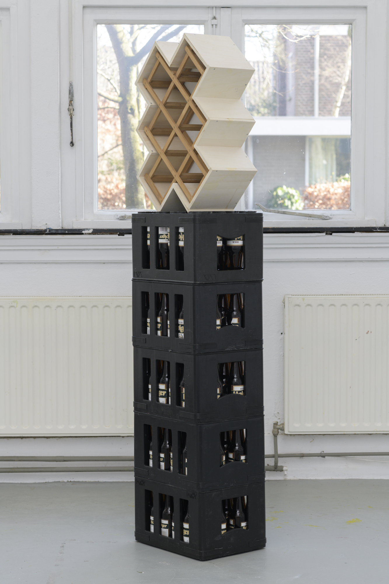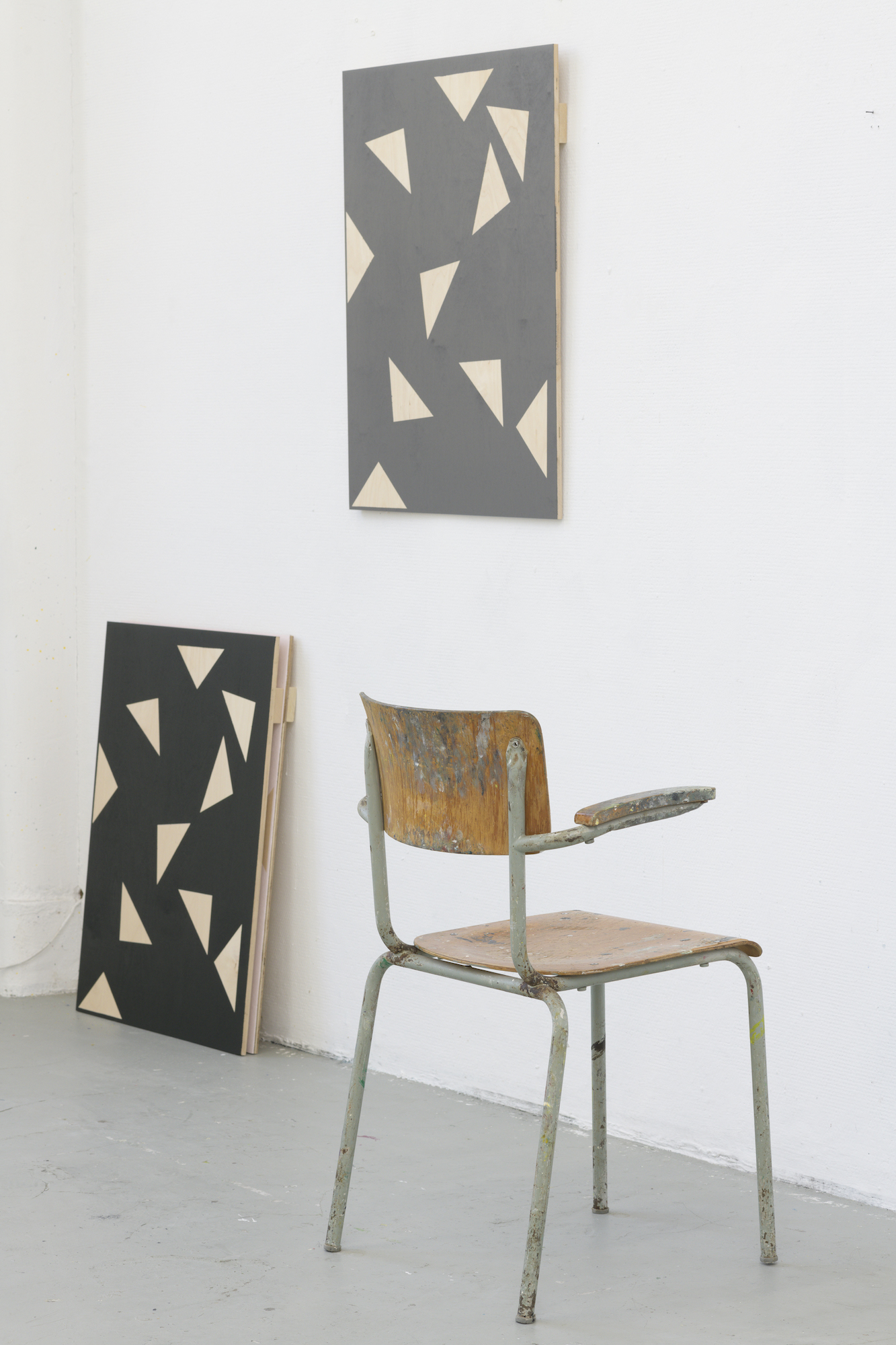 The casual remark by Kuipers about her having friends ‘outside the arts’, suddenly becomes meaningful. During my previous visit to the studio, there was a stack of beer crates with a painted wooden panel on it, tied together with a strap. The construction was build when Kuipers invited her friends over and thought she needed a table. For the occasion one of the painted panels hanging monumentally on the wall, was lifted from its pedestal for some airier entertainment. Such an intervention made me think of there being two types of artists: those with a social life and those that are married to their work. Through the light-footedness by which she fills the art space, without ever forgetting the viewer, I see Kuipers being one of the first category.The remark is hardly a statement for the half-abstract, half commonplace work she makes and yet it provides insight as to which decisions Kuipers makes in her work. While she’s making changes, she always takes the viewer into account, hoping they can still follow her reflections. I therefore suspect that her grandfather’s paintings, the chair, the bed, the carpet and the religious imagery are intended as support. They are residues of life and help the viewer to understand that Kuipers view on the matter isn’t always through the language of art.
